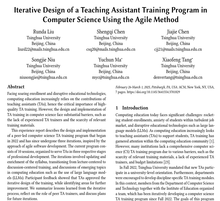 Recently, the 56th ACM Computer Science Education Technical Symposium (SIGCSE TS) was held in Pittsburgh, USA. A collaborative paper titled "Iterative Design of a Teaching Assistant Training Program in Computer Science Using the Agile Method" by faculty and students from the Department of Computer Science and Technology(Ma Yuchun, Chen Shengqi [PhD student], Chen Jiajie [PhD student], Niu Songjie[Postdoc]) and the Institute of Education (Tang Xiaofeng, Liu Runda [Master student]) has been accepted by SIGCSE TS 2025. The first author of the paper is Liu Runda, a bachelor's graduate from the Department of Computer Science and Technology, and current master's student at the Institute of Education. The corresponding authors are Professor Ma Yuchun from the Department of Computer Science and Technology, and Associate Professor Tang Xiaofeng from the Institute of Education.