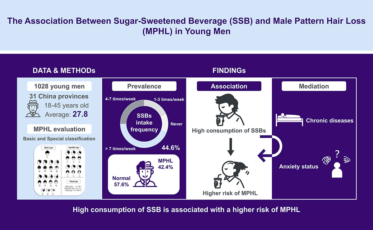 A recent survey study from scientists at Tsinghua University suggests that drinking large volumes of sugary drinks increased the likelihood of male pattern hair loss1 more than threefold, but this finding requires more investigation.