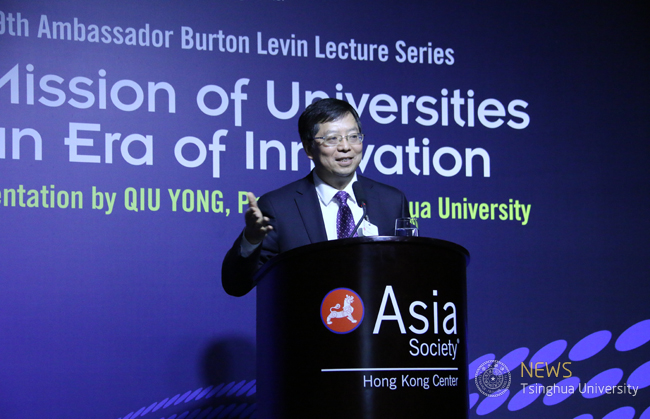Tsinghua University President Qiu Yong was invited by the Asia Society Hong Kong Center to deliver the keynote speech in the Ambassador Burton Levin Lecture Series on December 14, 2015.