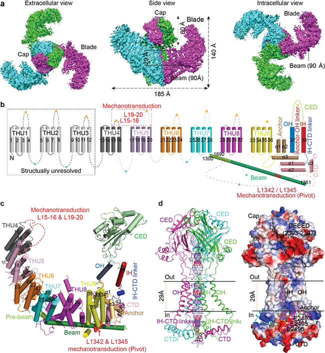 a, The three-bladed, propeller-like cryo-EM structure of the Piezo1 ion channel.