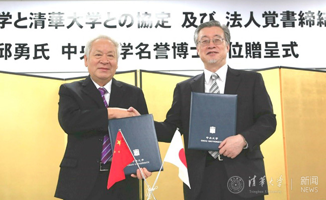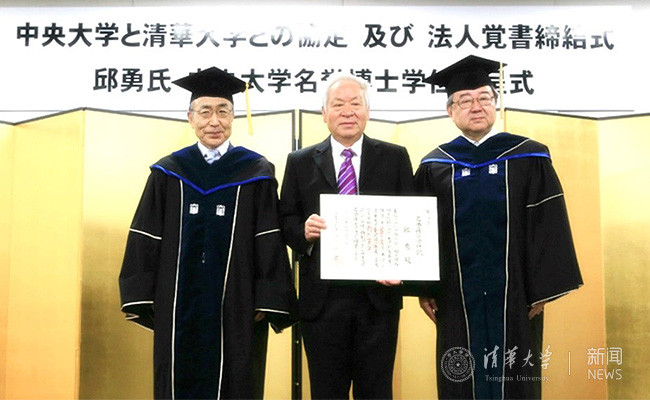 On July 23, the conferment ceremony to award an honorary doctorate to the President of Tsinghua University Qiu Yong was held at Chuo University, Tokyo, Japan. Attending the ceremony were Gu Binglin, former President of Tsinghua University, Xue Qikun, the Vice President of Tsinghua University, Shozaburo Sakai, the Chancellor of Chuo University, Tadahiko Fukuhara, the President of Chuo University, Masahiko Omura, the Chief Executive Regent of Chuo University, and other representatives from the two universities. Former President Gu Binglin received the honorary doctorate on behalf of President Qiu. 60 students from Tsinghua University and 10 entrepreneurs from the School of Continuing Education, Tsinghua University, attended the ceremony.