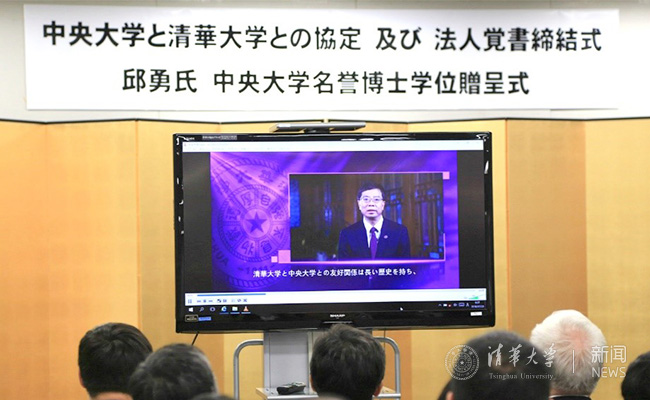 President Qiu expressed his sense of honor and thanks at receiving the honorary title from Chuo University in his speech delivered via video. He noted that Tsinghua University and Chuo University have had close ties and a friendly relationship for a long time. The Research Center for Japanese Studies established in Tsinghua University in 2009 further improved the joint research cooperation between the two universities. He hoped that the cooperation between the two universities would be further deepened and broadened to more fields in the future.