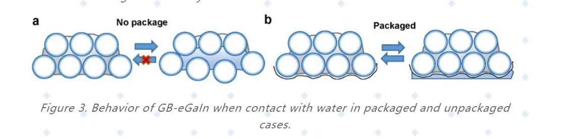 This material has good phase transition properties with the ability to switch between a completely soft state (like water) and a rigid metal level under temperature regulation. What’s more, when combined with water-proof package materials, GB-eGaIn can also realize controllable float and sink behavior. These results show the potential of diversity shaping and reliable mechanical/electrical performance of GB-eGaIn, indicating its feasibility for use as temperature-regulated functional components, and may offer potential use in developing advanced smart underwater devices.
