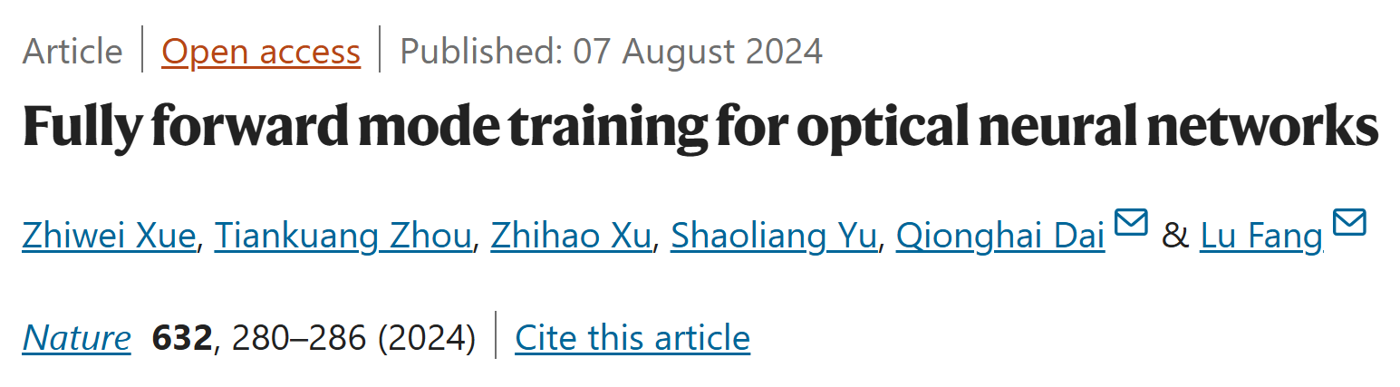 This research paper, titled "Fully forward mode training for optical neural networks," was published online in the journal Nature on the evening of August 7, Beijing time.