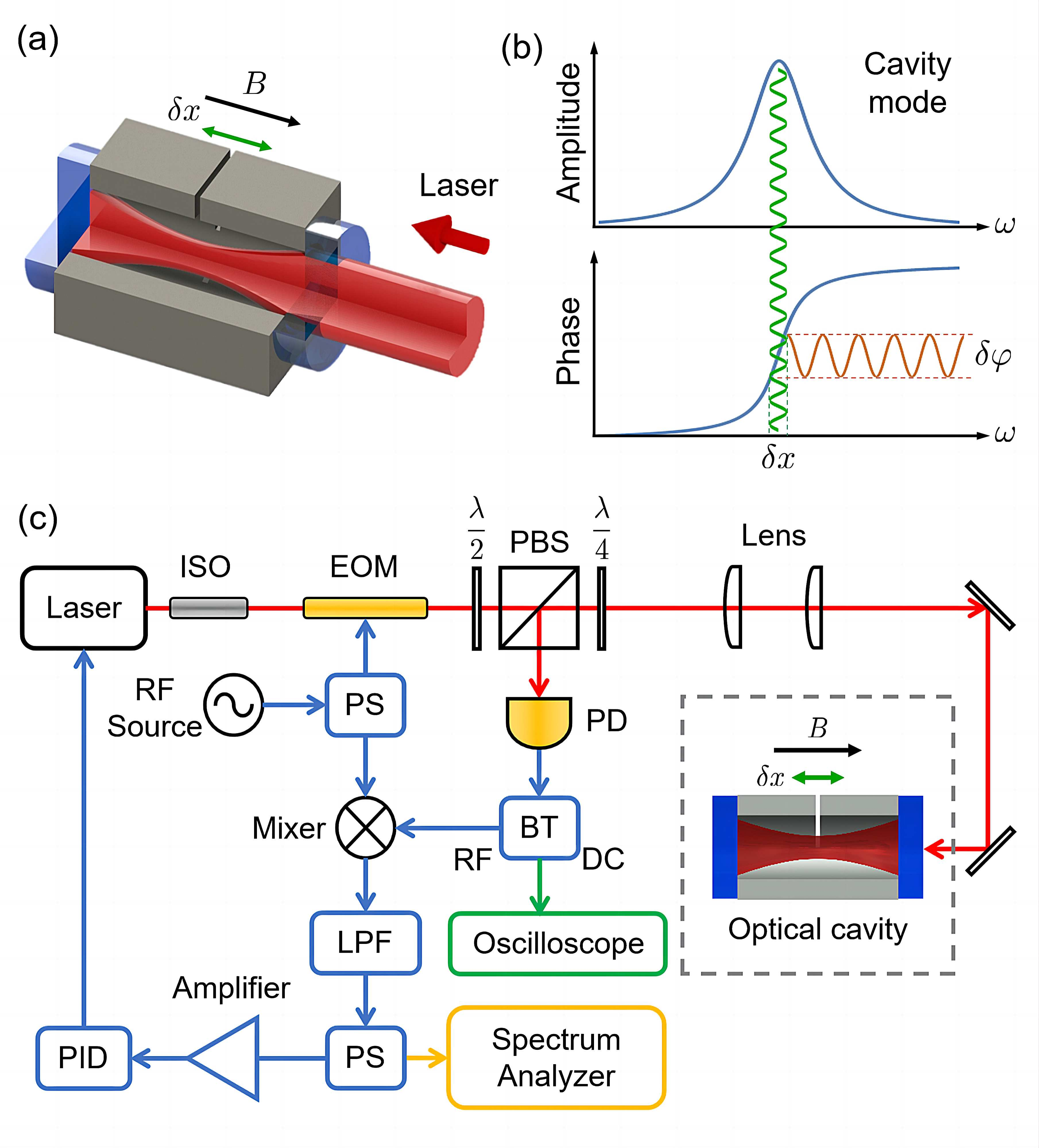 The magnetostrictive Fabry-Pérot cavity optomechanical system designed in this work is shown in Fig. 1. The system uses a magnetostrictive material alloy (Terfenol-D) as the main part of the optical cavity, with a high reflectivity concave-convex mirror on each side of the cavity, forming a high-finesse Fabry-Pérot optical cavity. If the external magnetic field changes, the magnetostrictive effect will cause the length of the optical cavity to change, which in turn causes the resonance frequency of the optical cavity to change. By using the Pound-Drever-Hall (PDH) frequency locking technique, the laser output frequency is locked to the resonance frequency of the optical cavity, and the change in resonance frequency can be measured through the PDH error signal. To achieve a sensitive response to the magnetic field, a special gap design is used in the structure of the optical cavity, introducing a "gap- swinging mechanical mode". This mechanical mode has the advantages of low resonance frequency and high quality factor, which can greatly enhance the resonance response to the magnetic field (Fig. 2).