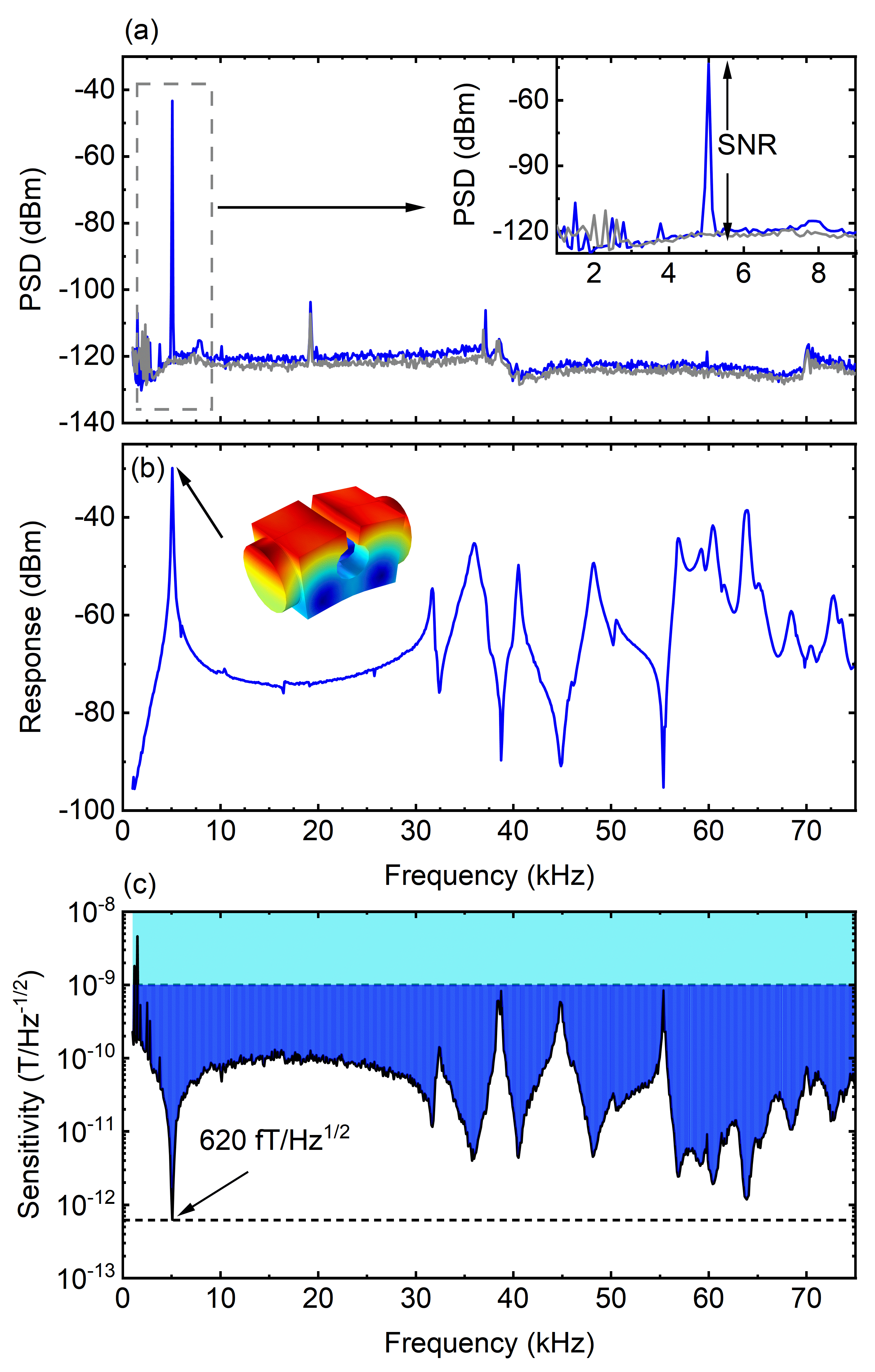 Fig. 2 Noise power spectral density, system response, and magnetometer sensitivity measurement results.