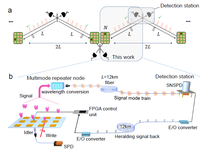 In this work, the research group led by Prof. Yunfei Pu and Prof. Luming Duan exploits time-bin multiplexing of totally 280 DLCZ quantum memory modes (70 independently addressable memory cells and 4 different angular modes) to fully fill the 12 km fiber. With this protocol, the time required for a single entanglement attempt was reduced from 120 microseconds to 850 nanoseconds, which increases the attempting rate by 140 times and enables fast distribution of remote atom-photon quantum correlation. The link efficiency reaches the world's best of 0.46. This also marks the first time that the link efficiency of metropolitan-scale quantum networks can reach the order of magnitude of unity. Notably, if two such quantum repeater nodes are entangled via single-photon interference in the future, the link efficiency can reach 0.92, potentially reaching the scaling threshold for metropolitan quantum networks and making future multi-node (more than 2) quantum network possible.