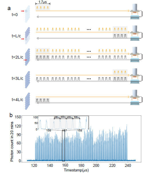 The research group led by Prof. Yunfei Pu and Prof. Luming Duan from Tsinghua’s Institute for Interdisciplinary Information Sciences has recently achieved multiplexing-enhanced generation of heralded atom-photon quantum entanglement over a 12 km fiber with a cold atom quantum repeater node. This work breaks several world records for metropolitan-scale (>10 km) quantum network, including: 1. The distribution rate of heralded atom-photon quantum entanglement over metropolitan distance (1.95 kHz); 2. The ratio of atom-photon entanglement generation rate to the quantum memory decoherence rate for metropolitan-scale fiber (also known as “link efficiency", reaching 0.46 in this work); 3. The enhancement factor of entangling rate through multiplexing (280 modes, 140-fold enhancement). The findings were published in Nature Communications, with the title "Fast delivery of heralded atom-photon quantum correlation over 12 km fiber through multiplexing enhancement."
