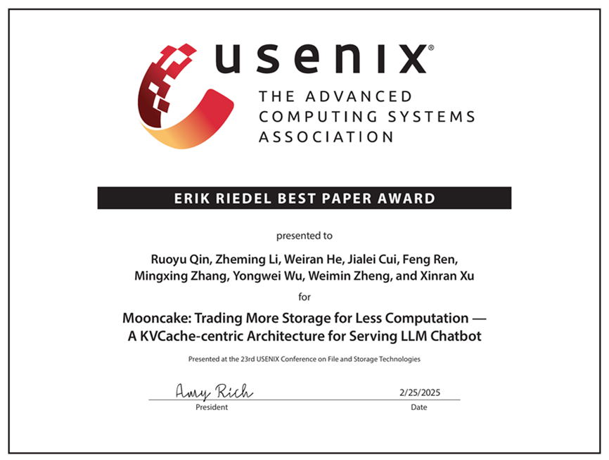From February 25 to 27, the 23rd USENIX Conference on File and Storage Technologies (FAST 2025) was held in Santa Clara, USA. A paper titled “Mooncake: Trading More Storage for Less Computation — A KVCache-centric Architecture for Serving LLM Chatbot,” co-authored by a research team led by Professors Mingxing Zhang, Yongwei Wu, and Weimin Zheng from the Department of Computer Science and Technology and Moonshot AI, won the Erik Riedel Best Paper Award. The paper’s first author is Ruoyu Qin, a PhD student from the Department of Computer Science and Technology, advised by Assistant Professor Mingxing Zhang.