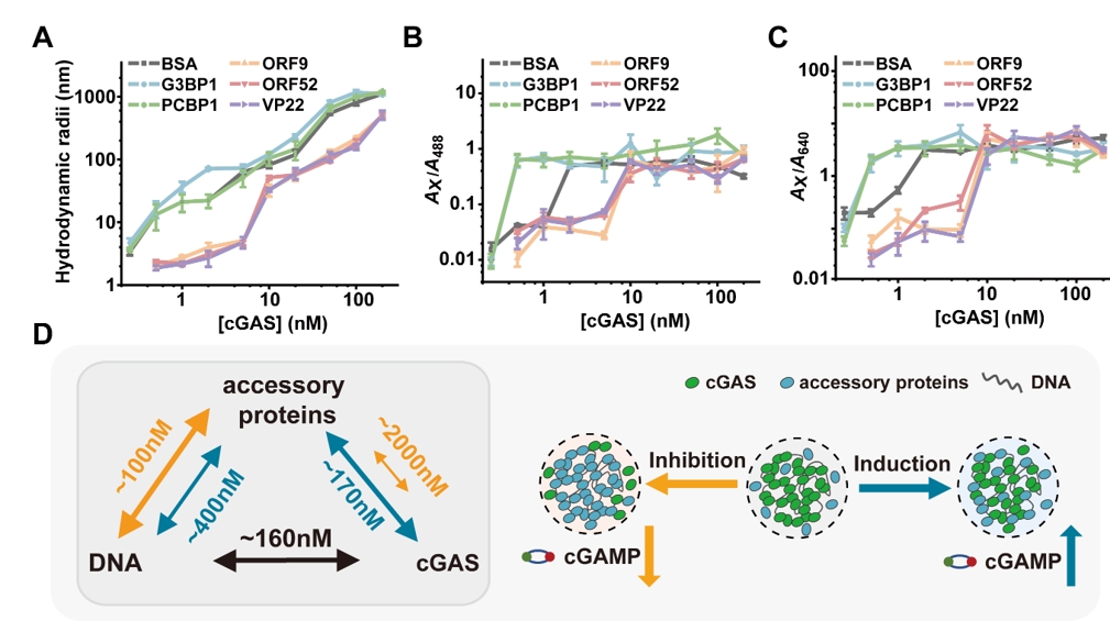 The proteins G3BP1 and PCBP1 were found to promote cGAS phase separation and enhance its activity, whereas the viral tegument proteins ORF9, ORF52 and VP22 exhibited inhibitory effects. Quantitative dcFCCS characterization showed that inhibitory accessory proteins significantly decreased the hydrodynamic radii of condensates and increased the critical concentrations for phase separation, whereas promoting accessory proteins increased the hydrodynamic radii of condensates and decreased the critical concentrations for phase separation. Further experiments showed significant differences in the binding affinities between these two types of proteins and cGAS. The promoting proteins have relatively strong binding affinities with cGAS. They are able to pre-bind to cGAS to form primary condensates, which can effectively promote the binding and phase separation of cGAS and dsDNA to enhance the enzymatic activity of cGAS. In contrast, viral tegument proteins, which have been shown to inhibit the phase separation and enzymatic activity of cGAS, exhibit weak interactions with cGAS, accompanied by stronger binding to dsDNA than to cGAS.