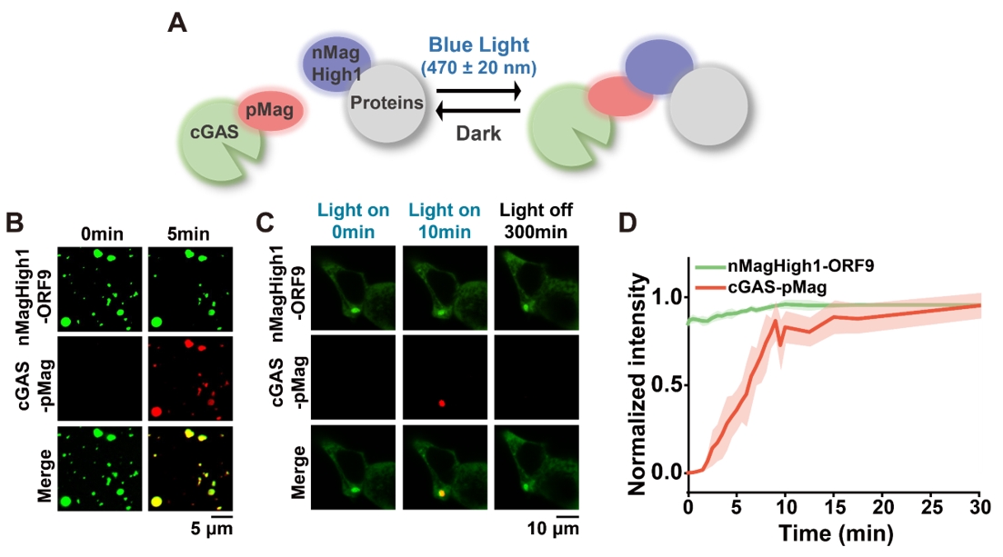 Light-inducible approaches tend to be more spatially and temporally precise than chemical-inducible approaches. The researchers used blue light irradiation to induce pMag-nMagHigh1 dimerization, thereby increasing the affinity between nMagHigh1 proteins and cGAS-pMag, which rapidly induced cGAS phase separation. In living cells, this light-inducible system reversibly regulated cGAS phase separation, with cGAS aggregates gradually dissociating after blue light termination.