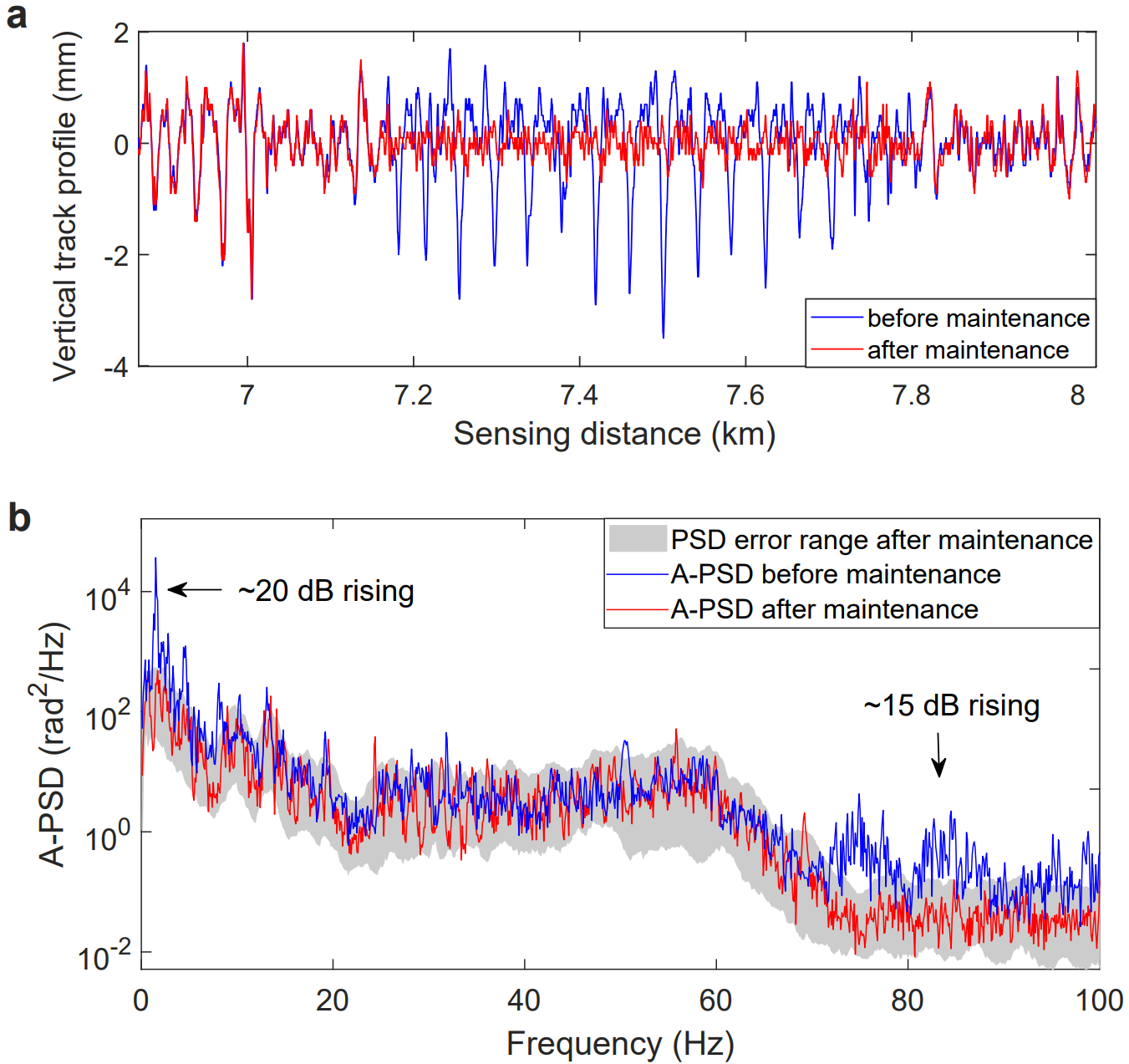 During the monitoring period, the HSR Engineering Section of the Beijing Railway Bureau carried out maintenance on a track section with minor creep deformation. Analysis showed that A-PSD of this section exceeded the error margin before maintenance, and returned within the margin afterward (Fig. 3). Similar cases further demonstrated the sensitivity of the A-PSD indicator to track faults.