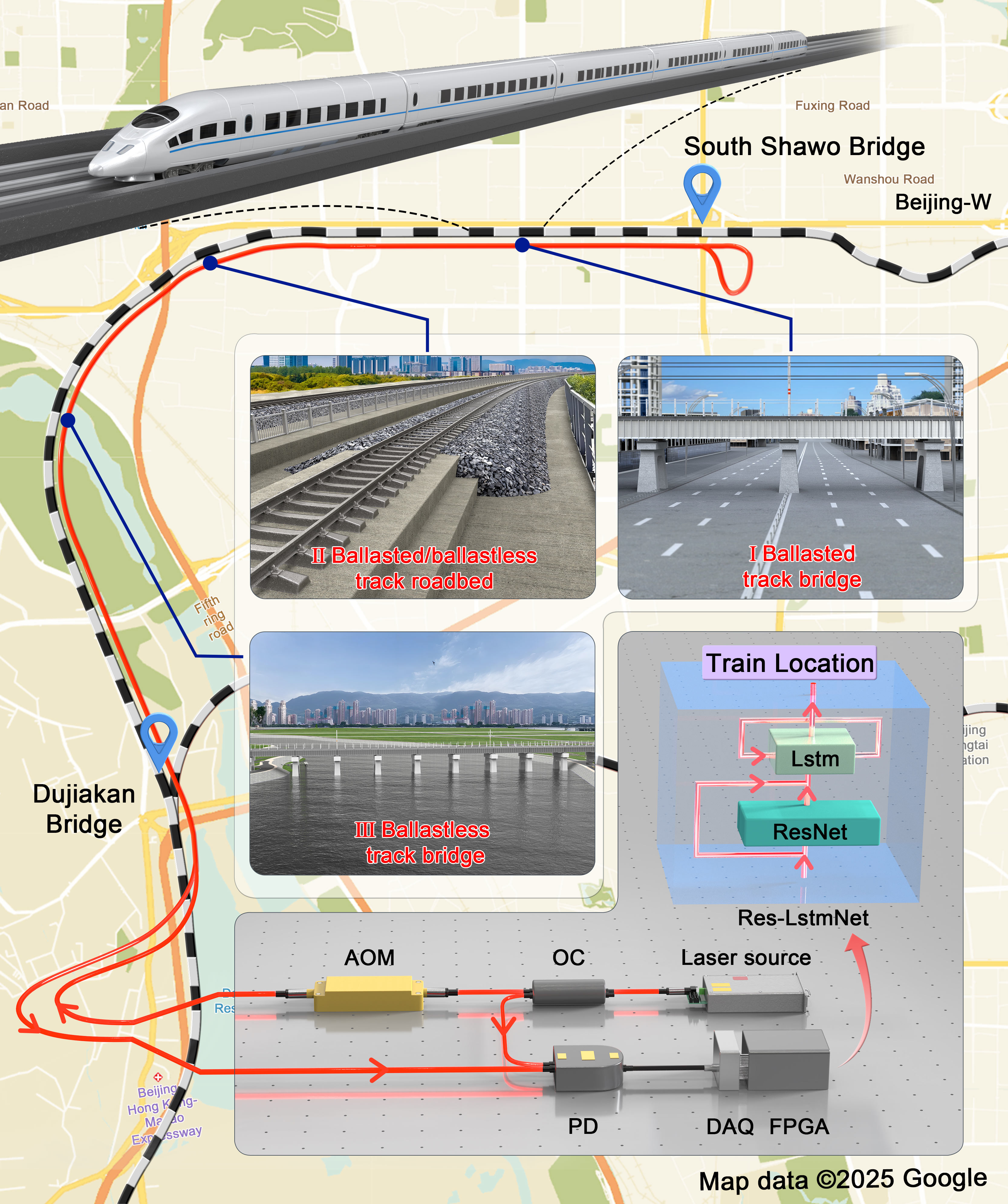 On May 3, a study titled “Laser Interferometry for High-Speed Railway Health Inspection using Telecom Fiber along the Line” was published in Nature Communications by Prof. Bo Wang’s team from the Department of Precision Instrument at Tsinghua University. The team developed a large-scale optical fiber interferometry platform (Fig. 1) using existing telecommunication fiber along a 12-km section of the Beijing–Guangzhou HSR. A neural network was employed to map the relation between train-induced vibration patterns and specific railway sections. By continuous vibration localization and section-by-section analysis, the 12 km railway was divided into several monitoring units, each with an A-PSD error margin that effectively indicates HSR health status.