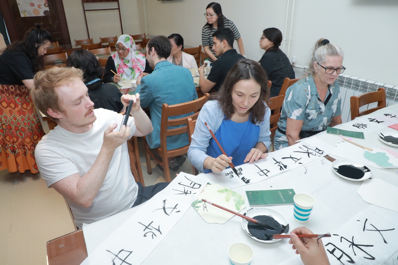 The tour was followed by an interactive cultural session. Under professional guidance, scholars engaged in hands-on experiences of ancient book restoration, woodblock printing, and Chinese calligraphy. International scholars learned to write “中华文脉” (The Thread of Chinese Civilization) using traditional brush techniques; during the activity, Professor Sinkinesh Atale Gebre from Beijing Foreign Studies University, originally from Ethiopia, pointed out the resemblance between the Chinese character “中” (zhōng) and a letter in her native script. She gladly demonstrated this remarkable parallel with a brush, even writing the word for “calligraphy” in Ethiopian script. Participants agreed that the event offered them fresh perspectives and memorable insights into the profound depth of Chinese civilization.