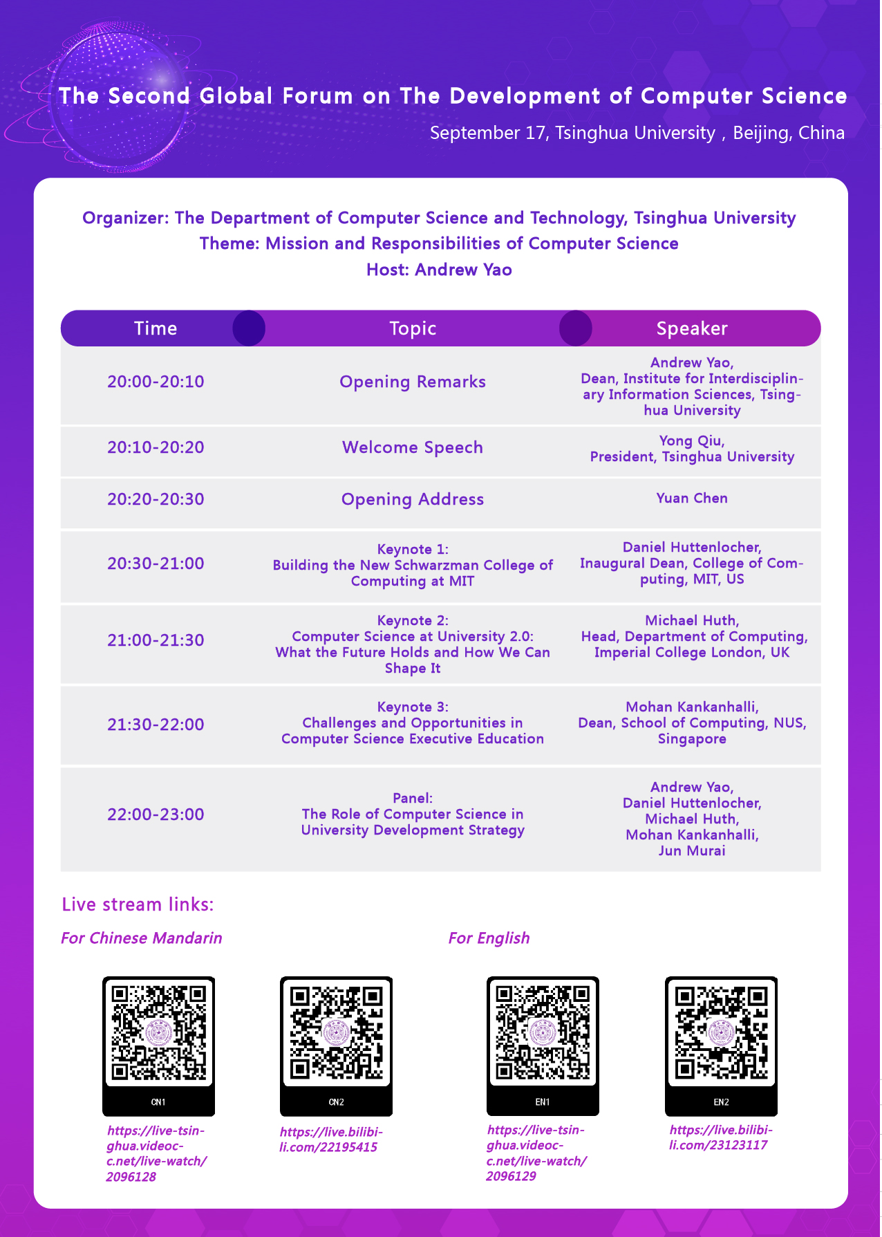 It is our great pleasure to invite you to attend the second Global Forum on Development of Computer Science (GFDCS), which will take place from 8pm-11pm on September 17th, 2021 (Beijing time). Due to the COVID-19 situation, the forum will be held online this year.