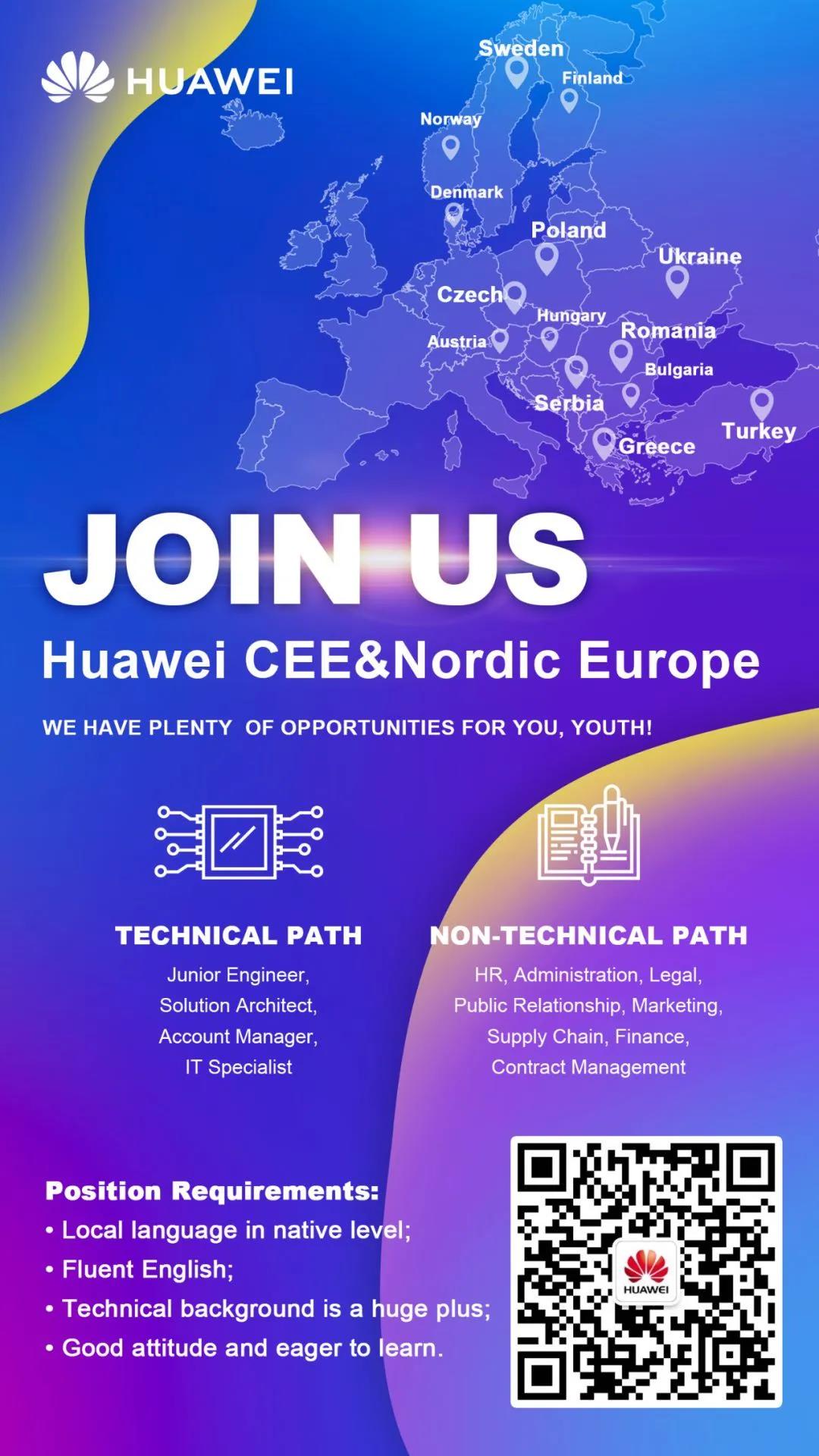 CV address of Northeast Europe region: https://career.huawei.com/socRecruitment/polandportal/job-detail.html?jobId=120653 (career.huawei.com—Worldwide—Northeast Europe--Junior Position for Fresh Graduates)