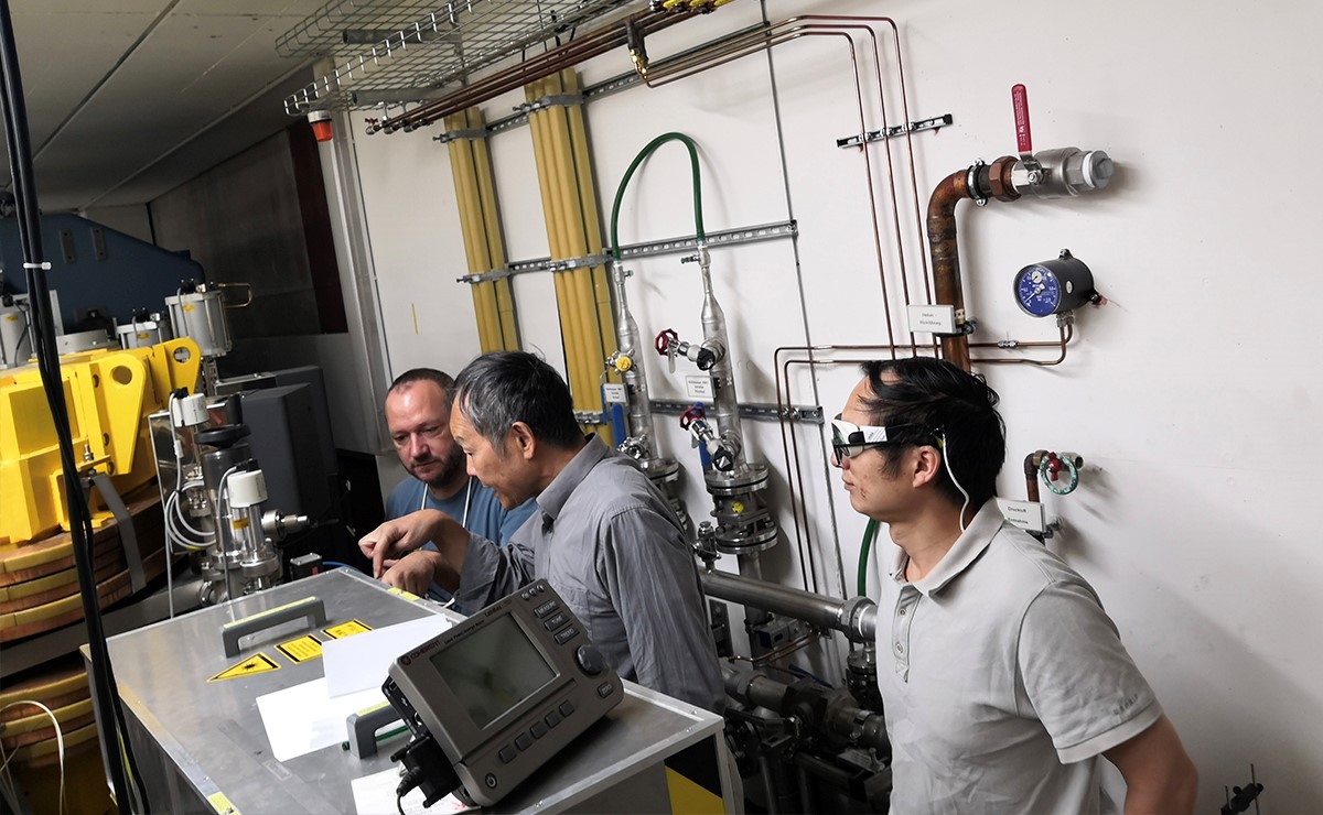 Dr Alexander Chao (centre), a co-author on the paper, works with colleagues to experimentally test steady-state microbunching (SSMB) in Berlin. He came up with the theory behind SSMB while at Stanford University, where he was a professor until he retired in 2019.