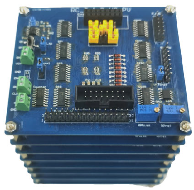Electronic implementation of a rotating neuron reservoir as a stack of eight 8-neuron circuits.