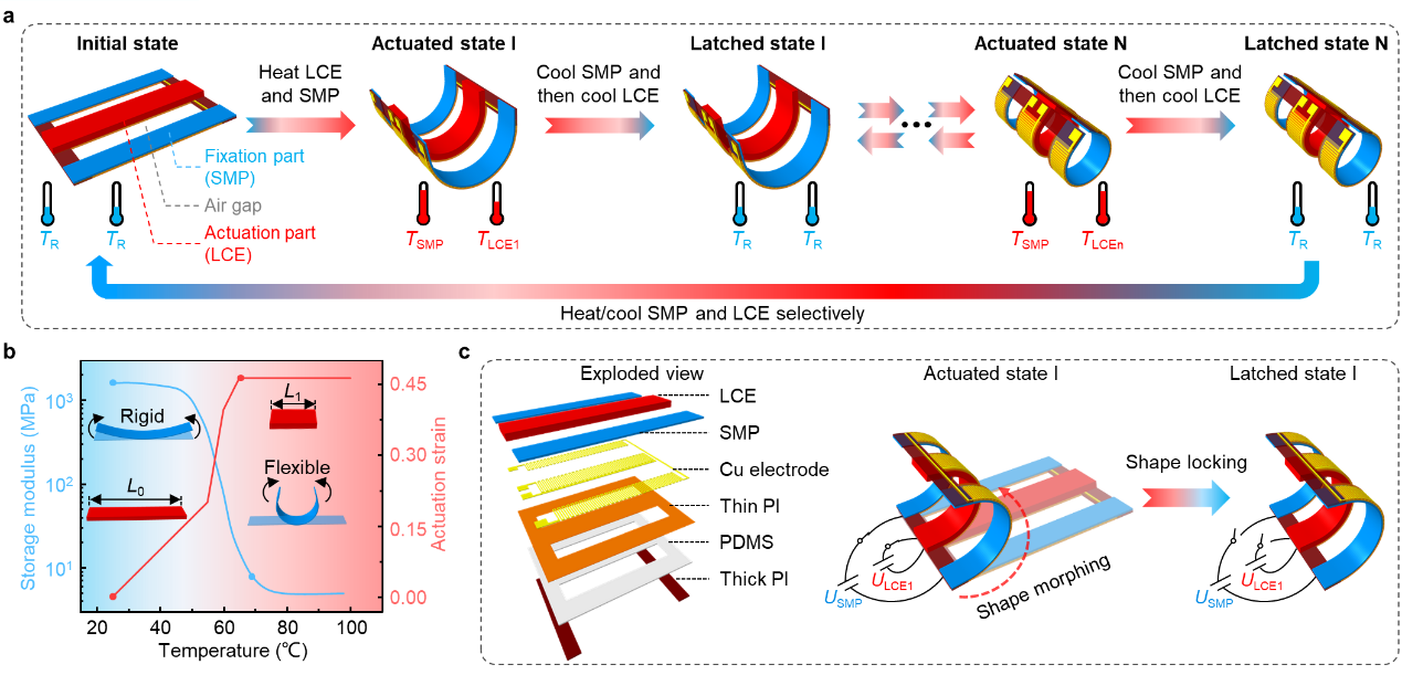 (a) Illustration of the continuous shape morphing and locking for the actuator. (b) Properties of the key materials used in the actuator. (c) Exploded view of the electrothermal actuator and schematic illustration of its shape morphing and locking.
