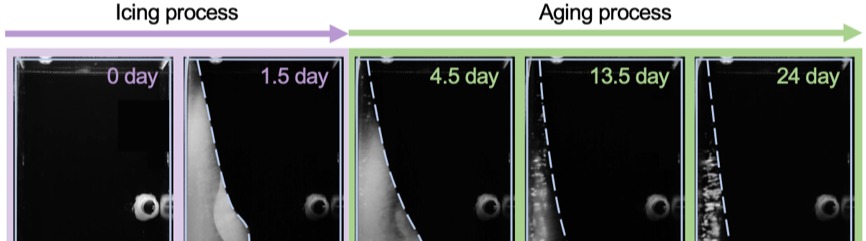 With a well-controlled ice-water phase change experimental system, the research team studied the complete process of salty water freezing till the final state over a period of 20 days. After a relatively rapid icing process, the ice layer continues to age slowly, characterized by a gradual decrease in its porosity (Fig. 1).