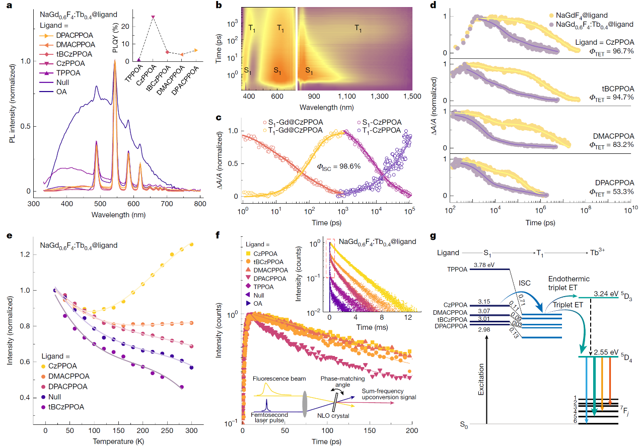 To elucidate the photophysical processes at the Ln-NC/organic molecule hybrid interface, the team employed various transient and temperature-dependent spectroscopic techniques. They observed a lanthanide-nanocrystal-induced acceleration of intersystem crossing (ISC) in the organic molecules (<1 ns), with an ISC efficiency reaching 98.6%. Notably, carbazole-modified phosphine oxide (CzPPOA) exhibited the most efficient triplet energy transfer (TET) efficiency to the lanthanide ions, achieving 96.7%. Further investigation revealed that this rapid TET benefits from well-matched energy levels facilitating endothermic TET and a significant suppression of interfacial non-radiative losses. The clarification of this ultrafast mechanism helps establish design principles and optimization directions for triplet exciton injection into insulating nanocrystals.