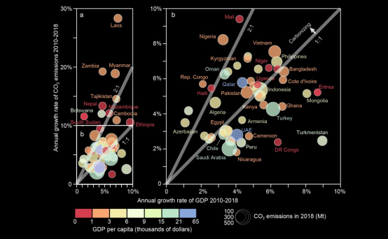 “These economies are not decoupled from emissions, yet,” Guan points out. The coupling of carbon dioxide emissions and gross domestic product is currently considered necessary in early stage industrialization. “Meanwhile, the annual costs of keeping emissions at a low level are in many cases 0.2%–4.1% of a countries’ gross domestic product, so there are trade-offs with poverty reduction goals and low-carbon technology investment,” says Guan.
