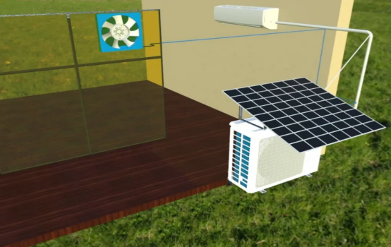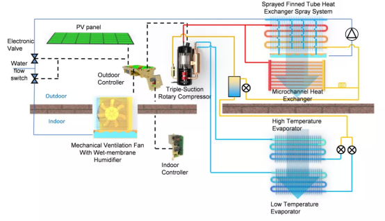 A schematic diagram of an ultra-efficient air conditioner with smart evaporative cooling ventilation and photovoltaic power.