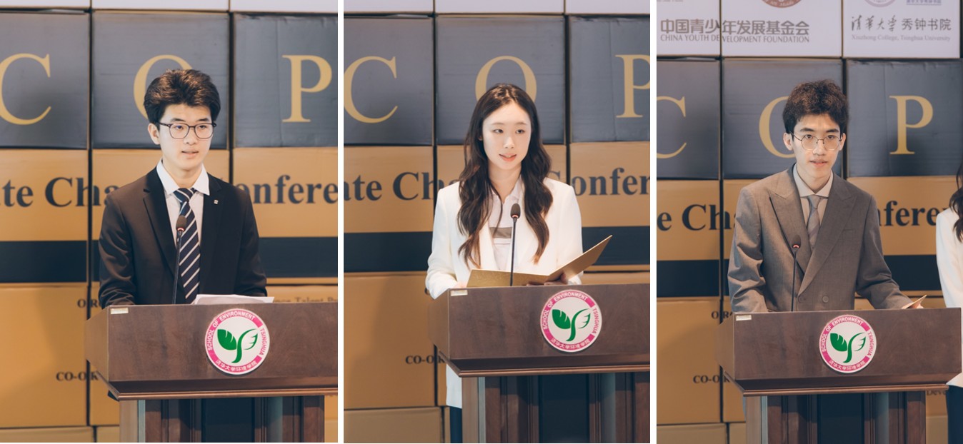 Secretaries-General of the main and satellite venues delivering speeches (from left to right): Hu Yunche, Du Shuyi, and Li Zishuo.