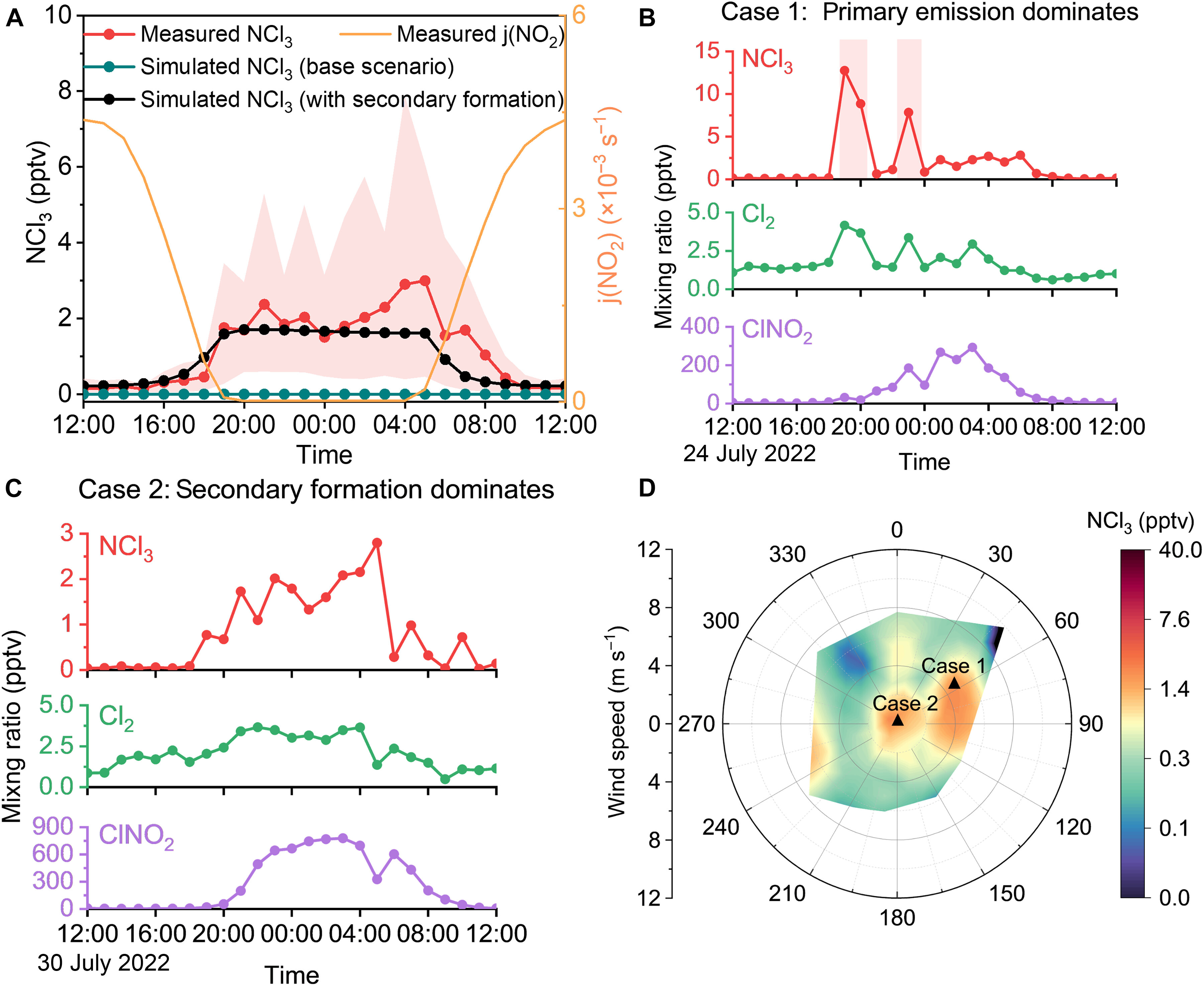 Figure 1. Characteristics of primary emissions and secondary formation of atmospheric NCl3 in Beijing during summer: (A) Average diurnal variation of observed vs. simulated NCl3; (B) Time series of a primary emission-dominated scenario; (C) Time series of a secondary formation-dominated scenario; (D) Concentration distribution of NCl3 under different wind speeds and directions.
