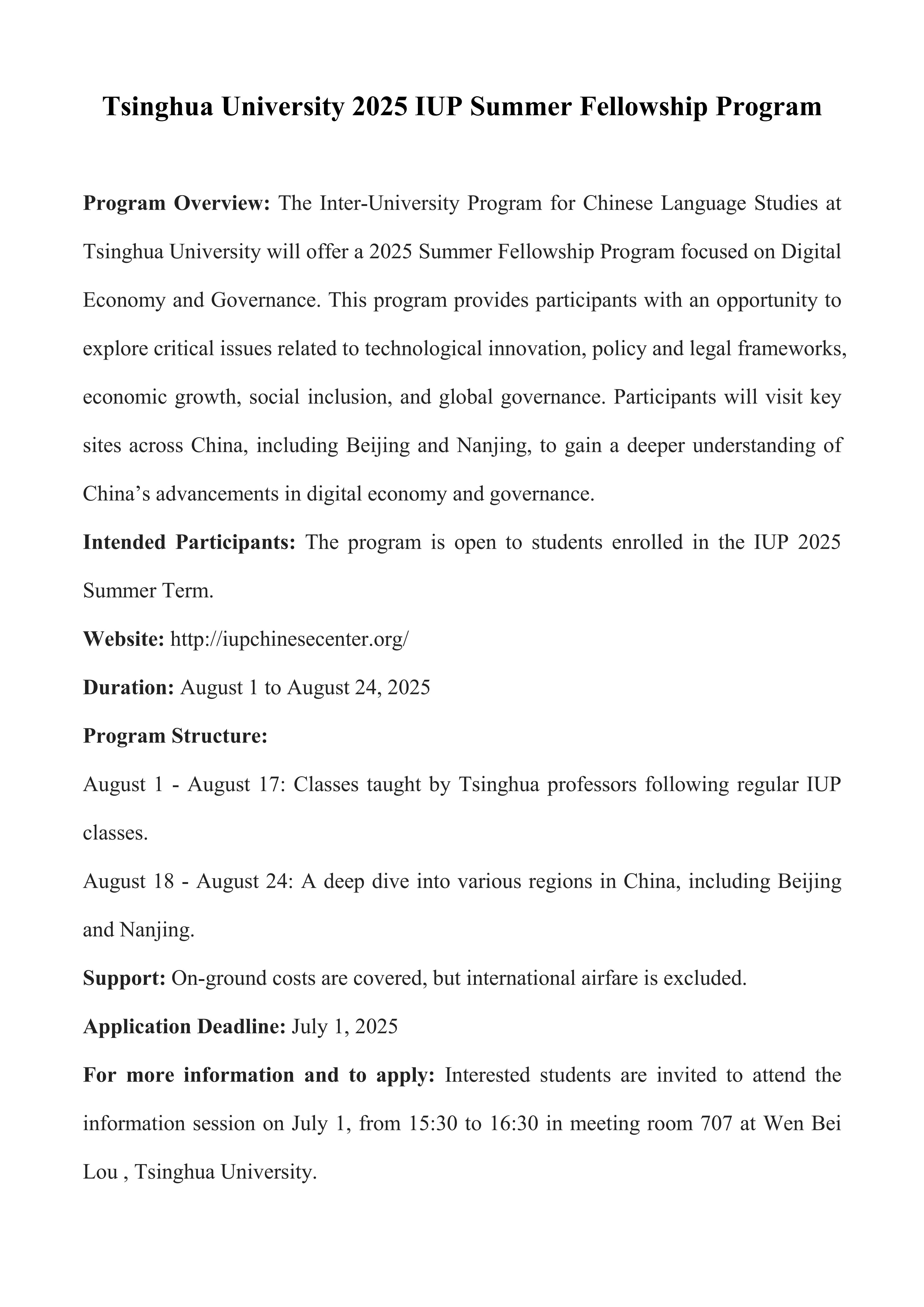 Tsinghua University 2025 IUP Summer Fellowship Program