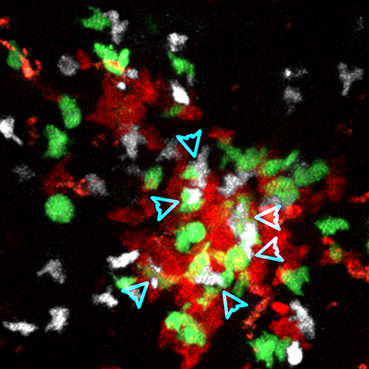 图为通过双光子显微镜实时观察到的生发中心内T细胞(白色)更倾向与正常 (绿色)而不是ICOSL缺陷型(红色)B细胞纠缠互作的情况。