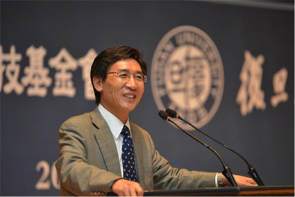 图为基金会顾问何大一、主席查懋声为薛其坤颁奖。