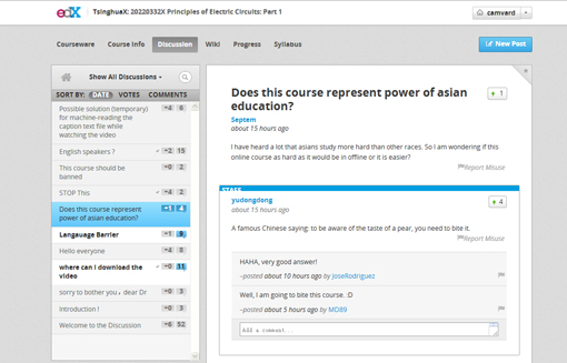 10月17日edX平台上的《电路原理》正式开课当天,共有来自151个国家和地区的8313名学生选修该课程,地理分布极为广泛。选课人数最多的是印度(1617人),其次是美国(1085人)、中国(478人)。选课人数超过100的国家还包括巴基斯坦、巴西、英国、墨西哥、埃及、俄罗斯、西班牙、哥伦比亚、波兰、加拿大等。同期开设此课的“学堂在线”平台上,共有1775人选课。两个平台上的选课人数总计超过10000人次。于歆杰表示,《电路原理》课程每年在清华校内授课规模约500人,10000名学习者意味着以往授课20年的学生总和,正是MOOC让曾经的天方夜谭变为了如今的现实。