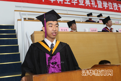 毕业生代表、交叉信息研究院贾志豪同学回顾了在清华“累并快乐着,辛苦并充实着”的学习生活经历,以“舍不得”三个字向辛勤培养自己的母校及师长们表达了深深的谢意和留恋。即将赴美国斯坦福大学攻读博士学位的他与同学们分享了自己在清华体悟到的“做最好的自己”、“真正的热爱值得百分百的专注”,以及“同学是一生的财富”三句话的丰富内涵,表示将坚持梦想,精益求精,追求完美,不断实现自我的超越。