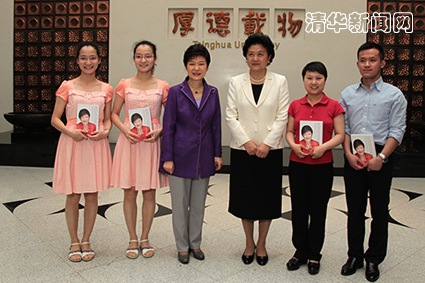 演讲前,刘延东、陈吉宁、胡和平等与朴槿惠总统在三楼会议室进行了简短会晤,并在清华校训“自强不息、厚德载物”背板前合影留念。