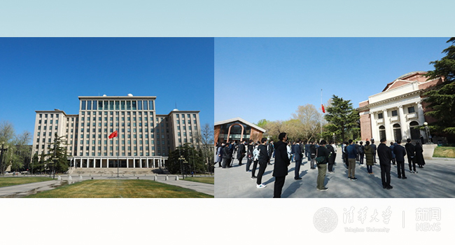 防空警报声在清华园上空响起,无法到现场的执勤保安们也自发地在校园各处默哀悼念。