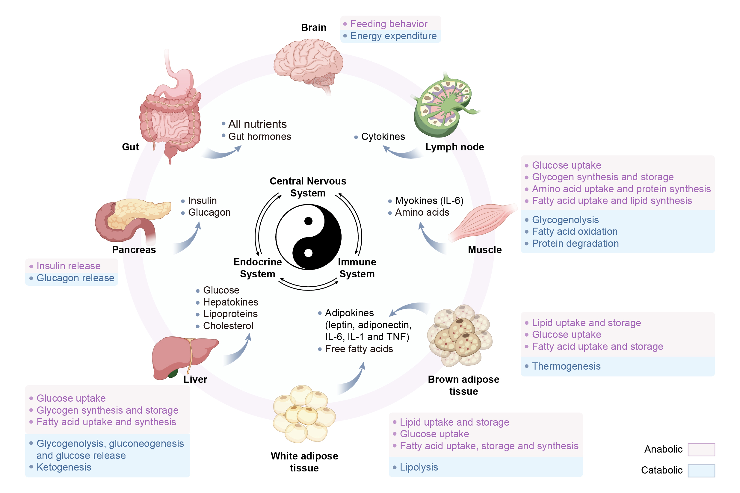 乐竞(中国)网8月19日电 代谢相关疾病(如肥胖、2型糖尿病、脂肪肝等)已成为威胁人类健康的主要慢性疾病之一。世界卫生组织预测,到2030年,全球糖尿病患者可能突破5亿。如何揭示机体在复杂环境下维持代谢稳态的机制,是国际医学研究的前沿问题。长期以来,研究者多聚焦于单一激素或分子通路,例如胰岛素、瘦素等,但这种“线性视角”难以解释代谢疾病的全貌。建立多系统协同作用的整合框架,已成为该领域亟需解决的科学挑战。