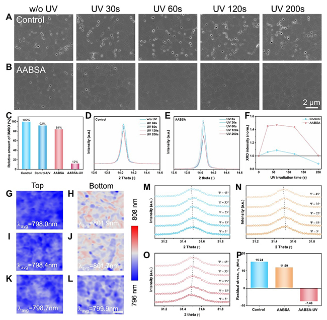 实验结果表明,单纯的紫外处理并不能有效减少埋底界面处的孔洞缺陷;而只有在光响应分子AABSA存在的钙钛矿薄膜中,紫外光照才能显著抑制这类界面孔洞。NMR定量分析显示,经紫外处理的AABSA改性钙钛矿薄膜中DMSO残留量显著降低,仅为对照组薄膜的12%,证实了AABSA分子在光诱导异构化过程中对DMSO残留的高效清除作用。此外,DMSO的动态移除与AABSA的界面修饰效应协同作用,全面提升了钙钛矿薄膜的质量。光致发光mapping分析表明,改性薄膜从底部到顶部的PL峰位差异仅为1.2nm,显示出高度一致的结晶有序性;残余应力测试结果进一步揭示,原本处于拉伸应力状态的薄膜埋底区域转变为压缩应力状态,结构稳定性得到增强。同时,AABSA的引入优化了钙钛矿与传输层之间的能级匹配,有效改善了电荷的抽取与传输效率。