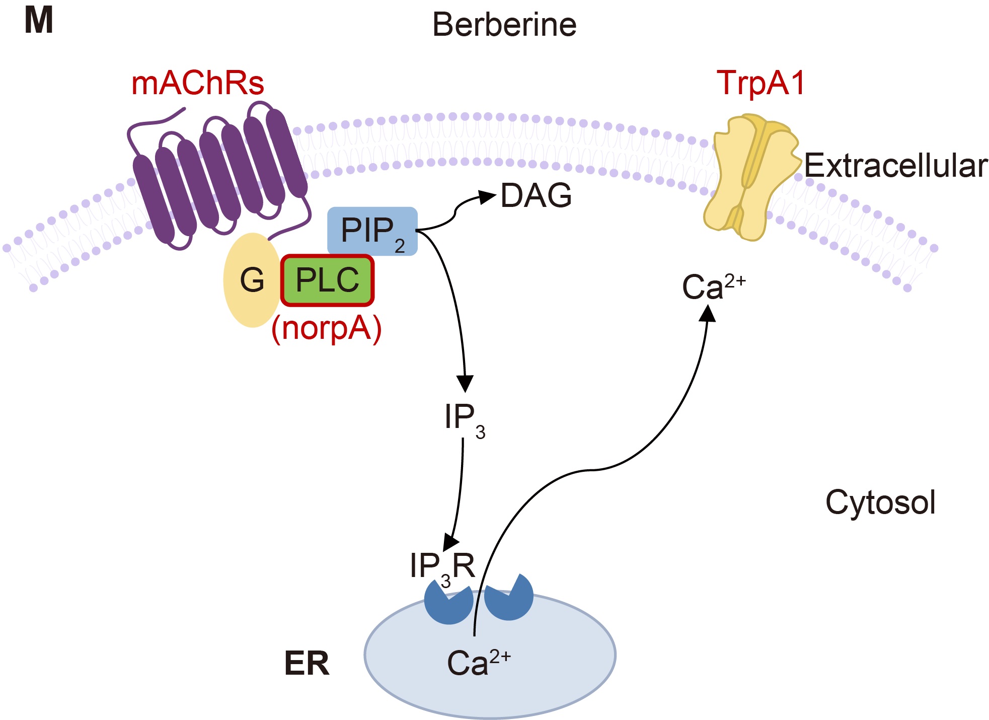 为阐明黄连素诱导呕吐的分子机制,研究团队聚焦于TrpA1——一种在哺乳动物和果蝇中均高度保守的化学感受器。TrpA1突变后,果蝇呕吐行为显著减少,表明TrpA1在呕吐中起重要作用。然而,现有研究显示黄连素无法直接激活TrpA1,提示其作用可能通过间接通路实现。进一步实验发现,敲除磷脂酶C(PLC)核心基因norpA的果蝇无法呕吐,支持了TrpA1可能通过GPCR和PLC通路被激活的假设。研究人员随后测试了多种GPCR激动剂,发现仅乙酰胆碱(ACh)和胆碱能显著诱导呕吐。由于黄连素可抑制胆碱酯酶,团队使用两种胆碱酯酶抑制剂进行验证,均观察到类似效果。此外,针对毒蕈碱型乙酰胆碱受体(mAChRs)的激动剂比烟碱型受体激动剂更有效,提示mAChRs在这一过程中起主导作用。双重突变实验进一步证实,TrpA1和mAChRs(特别是mAChR-B和mAChR-C)协同工作,而非平行通路。基于此,研究提出了黄连素通过mAChRs-PLC通路间接激活TrpA1的模型。