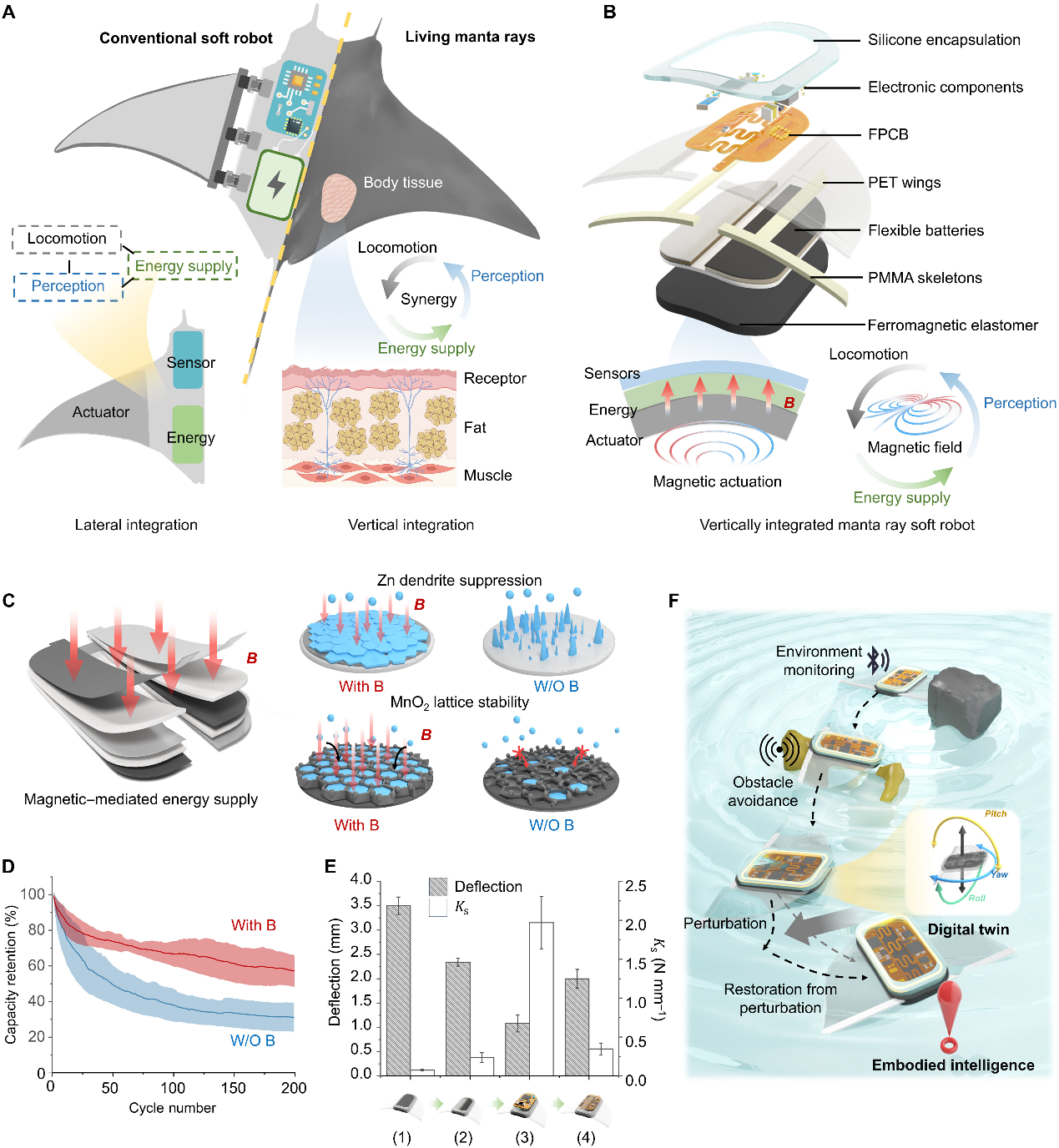 近日,乐竞官方端网站登录入口深圳国际研究生院丁文伯副教授所在的智能感知与机器人(Smart Sensing and Robotics, SSR)课题组与周光敏副教授课题组合作提出了一种磁驱动柔性电池集成机器人。该机器人集成的抗形变柔性电池,在机器人固有磁场增强下表现出优异性能,在200次循环后的容量保持率具有57.3%。这种柔顺电池可在机器人本体上实现44.9%的大面积部署,并通过与合理设计的柔性混合电路进行垂直集成,在保持可变形性的同时将额外刚度降至最低。这种执行器–电池–传感器的柔性垂直集成方法最大化了功能区域的利用率,并在仿鳐鱼软体机器人中得以实现,从而构建了一个具备感知、通信和稳定供能能力的无束缚平台。该系统在水下环境中展示了具身智能,包括扰动修正、避障和温度监测等多样化功能,并通过本体感知与环境感知实现了磁驱动运动过程中的实时决策。