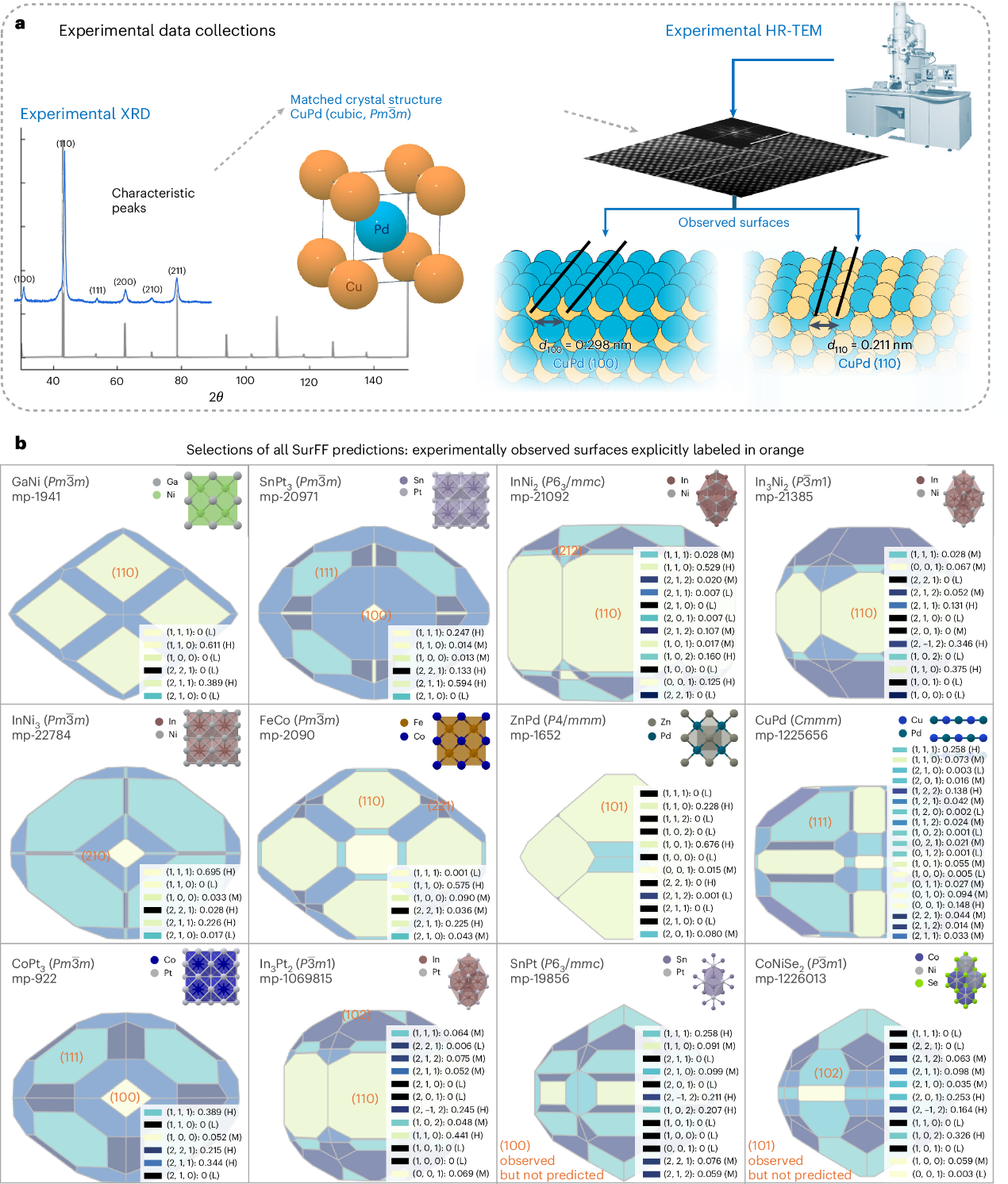 首先,团队针对催化材料表面是否稳定、能否合成这一基础性问题,创制了“SurFF”表面性质基础模型,通过主动学习策略构建了一个涵盖万余种合金表面的大规模数据库,以精准预测晶体材料的表面能和平衡形貌(Wulff构型)。在保持同等精度的前提下,SurFF比传统的密度泛函理论(DFT)计算效率提升了5个数量级以上,且首次实现了对数千种晶体材料可合成性与表面暴露情况的高通量筛选。同时,团队利用大语言模型挖掘了大规模文献数据(1万余篇催化文献XRD/TEM面指数信息),结合原创实验数据,在真实催化体系中验证了模型的准确性。该工作为催化剂理性设计及下一代自驱动材料研发闭环提供了坚实支撑。相关成果以“SurFF:一种跨金属间化合物晶体表面暴露与形貌的基础模型”(SurFF: A Foundation Model for Surface Exposure and Morphology Across Intermetallic Crystals)为题,于9月9日发表于《自然·计算科学》(Nature Computational Science)。