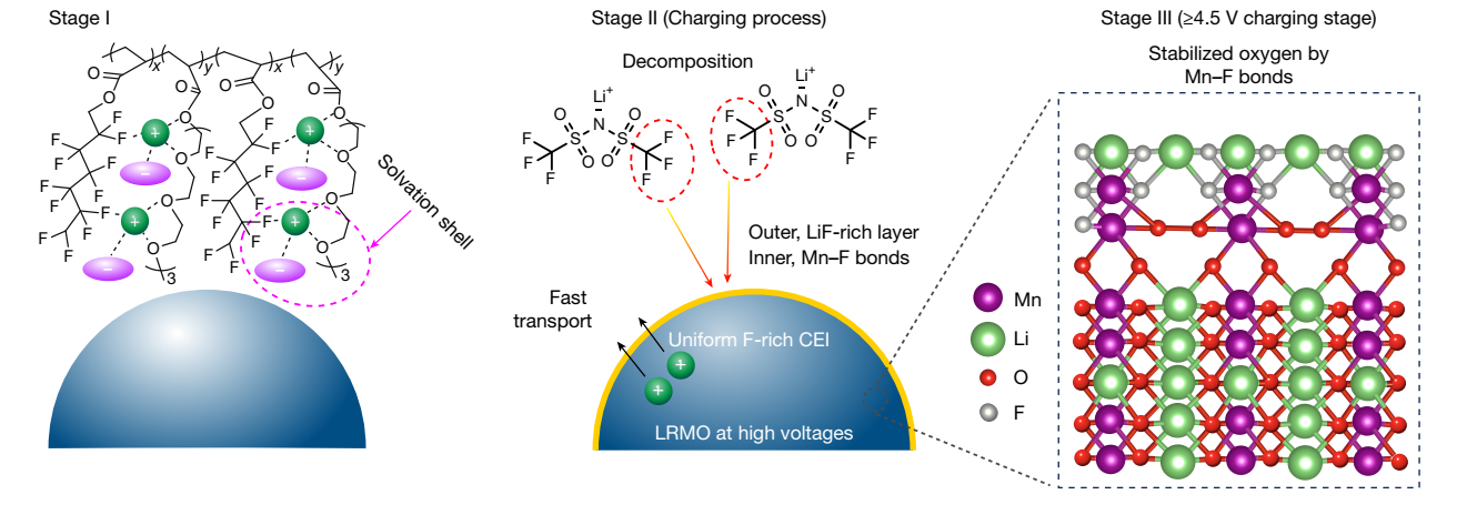 近期,乐竞官方端网站登录入口化工系张强教授团队提出“富阴离子溶剂化结构”设计新策略,成功开发出一种新型含氟聚醚电解质。该电解质通过热引发原位聚合技术,有效增强了固态界面的物理接触与离子传导能力。研究团队在聚醚电解质中引入强吸电子含氟基团,显著提升了其耐高压性能,使其可匹配4.7V高电压富锂锰基正极,实现了单一电解质对高电压正极与金属锂负极的同步兼容。基于锂键化学原理,团队构建了独特的“–F∙∙∙Li⁺∙∙∙O–”配位结构,诱导形成具有高离子电导率的富阴离子溶剂化结构,进而在电极表面衍生出富含氟化物的稳定界面层,显著提升了界面稳定性。