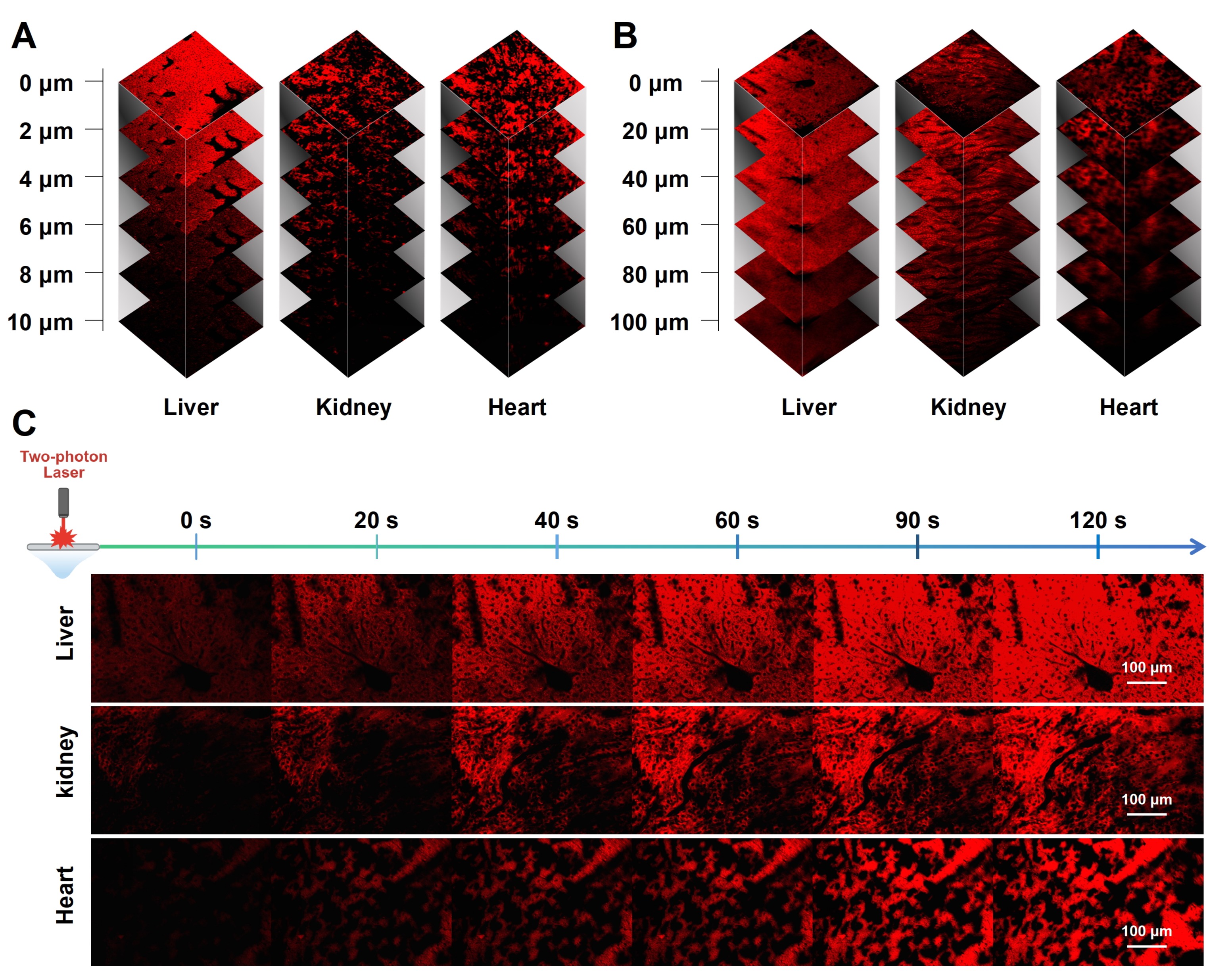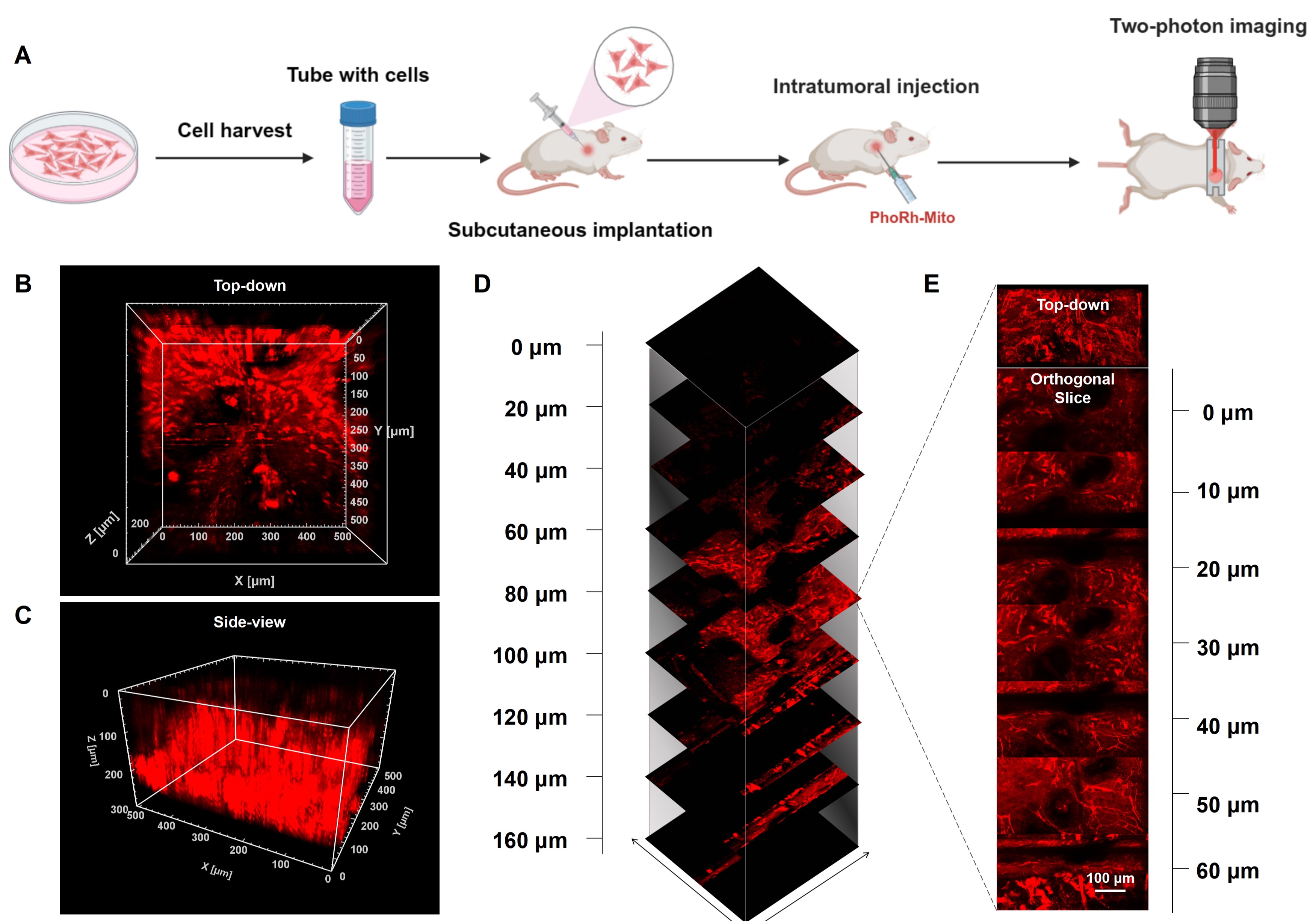 进一步地,研究团队在离体小鼠肝脏、肾脏和心脏组织中验证了PhoRh-Mito的深组织成像能力。双光子激发下,探针可实现高达100μm的成像深度,远优于单光子成像的10μm穿透极限。此外,在荷瘤小鼠模型中,通过瘤内注射PhoRh-Mito,研究团队成功实现了皮下肿瘤的高分辨率三维结构成像,清晰呈现了细胞边界、微血管网络等细微结构。