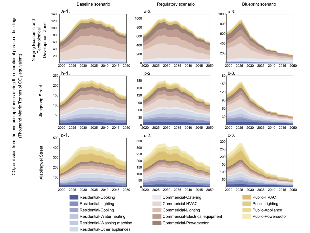 图2.不同减排情景下典型街道的碳排放路径(2020-2050)