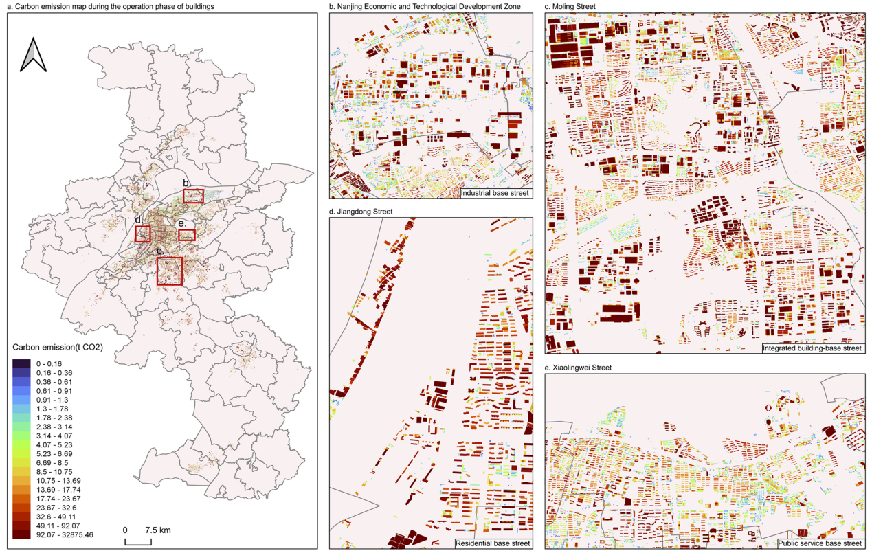 研究结果显示,南京市建筑运行碳排放存在显著的空间和功能异质性。空间上,中心城区排放分布均匀,而郊区则呈现多点开花的模式。研究显示,南京街道的碳排放特征与主导建筑功能密切相关,可以分成“工业基地型”(如南京经济技术开发区)、“综合型”(如秣陵街道)、“居住型”(如江东街道)和“公共服务型”(如孝陵卫街道)四种典型类型。