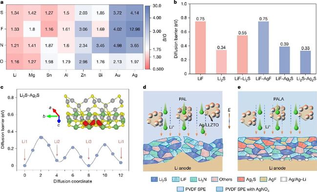 研究团队从SEI结构和模型进行源头创新,摒弃传统SEI“唯强度论”的结构模型和设计理念,将“塑性”特征作为新型SEI组分筛选的核心指标,以Pugh准则为塑性判据(B/G比值≥1.75表明组分具有塑性,其中B为体模量,G为剪切模量),通过对一系列潜在无机物进行了人工智能加速的理论筛选,发现硫化银、氟化银等材料不仅具备良好的塑性变形能力,还能够显著降低锂离子的扩散能垒。