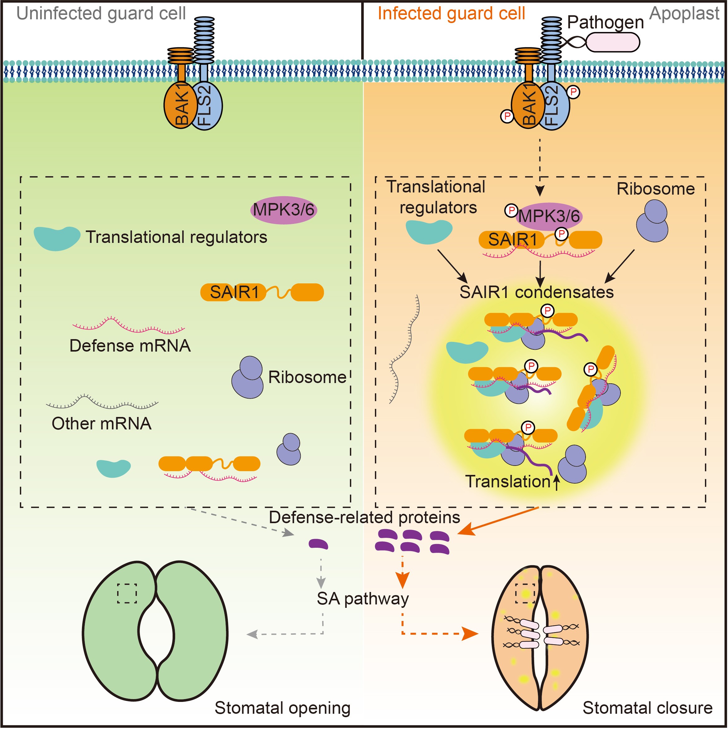 乐竞(中国)网11月21日电 气孔(stomata)是植物叶片表皮成对保卫细胞及空腔组成的开孔结构。多种致病细菌和真菌通过气孔入侵植物引发严重的植物病害,保卫细胞则会感知病原菌信号,关闭气孔以限制病原菌入侵,该过程被称为气孔免疫(stomatal immunity),构成植物有效阻止病原菌入侵的首要防线。解析气孔免疫的分子机制对于防治植物病害具有重要意义。植物细胞存在液-液相分离驱动形成的生物分子凝聚体,在植物生长发育和环境适应中发挥重要作用。然而,领域内对于是否存在保卫细胞特异凝聚体调控气孔免疫及其分子机制尚不清楚。
