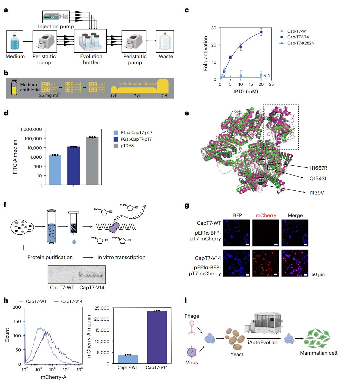 利用该系统对活性近乎为零的前体CapT7进行蛋白质功能进化。为了赋予T7 RNAP加帽能力以扩大其应用效果,团队将非洲猪瘟病毒的加帽酶与其进行融合,有望应用于哺乳动物细胞中的正交基因表达和疫苗开发等领域。在该平台上进行了一个完全自动化多组平行的定向进化过程,在96孔板中并行启动超过100条独立进化线,每天9个循环进行连续25天,再接入连续流式装置追加10天高浓度筛选,最终获得变体CapT7-V14。该变体在酵母内使靶基因表达提升30倍;在体外转录反应中可合成带帽mRNA;在HEK293T细胞中,其驱动的荧光蛋白水平与CMV、EF1α等哺乳动物强启动子相当,实现“原核启动子直接用于人源细胞”的跨界表达。