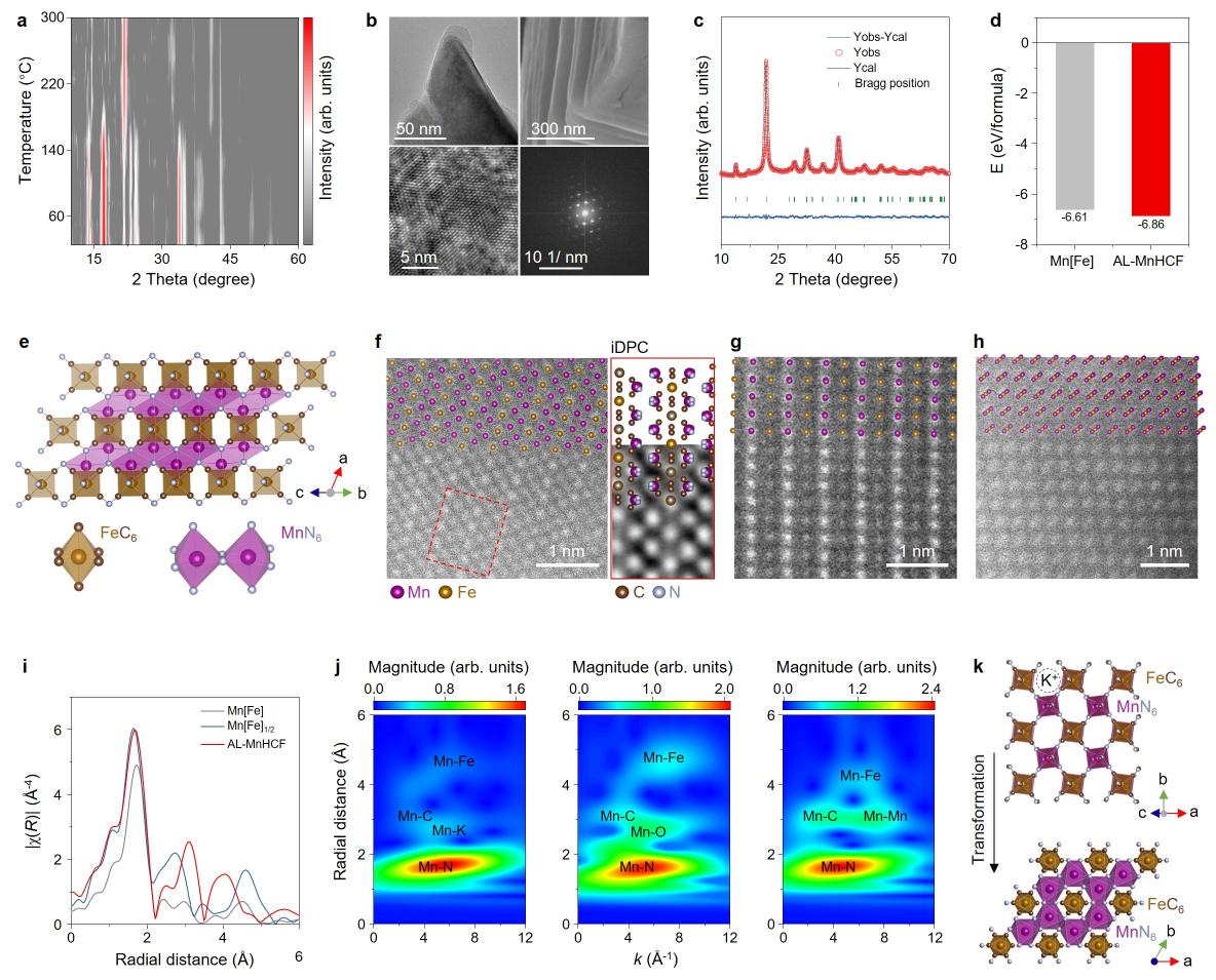 研究团队针对普鲁士蓝结构中的阴离子空位存在形式及其调控开展研究。通过解析锰基普鲁士蓝在合成生长过程中空位的潜在形成机制,提出了一种基于反应物价态调控的策略,实现了结构型空位的可控生成。研究证实,该有序排列的空位为离子传输提供了额外的转移路径,并且能够缓解充放电过程中的相变,从而有效提升循环和倍率性能。