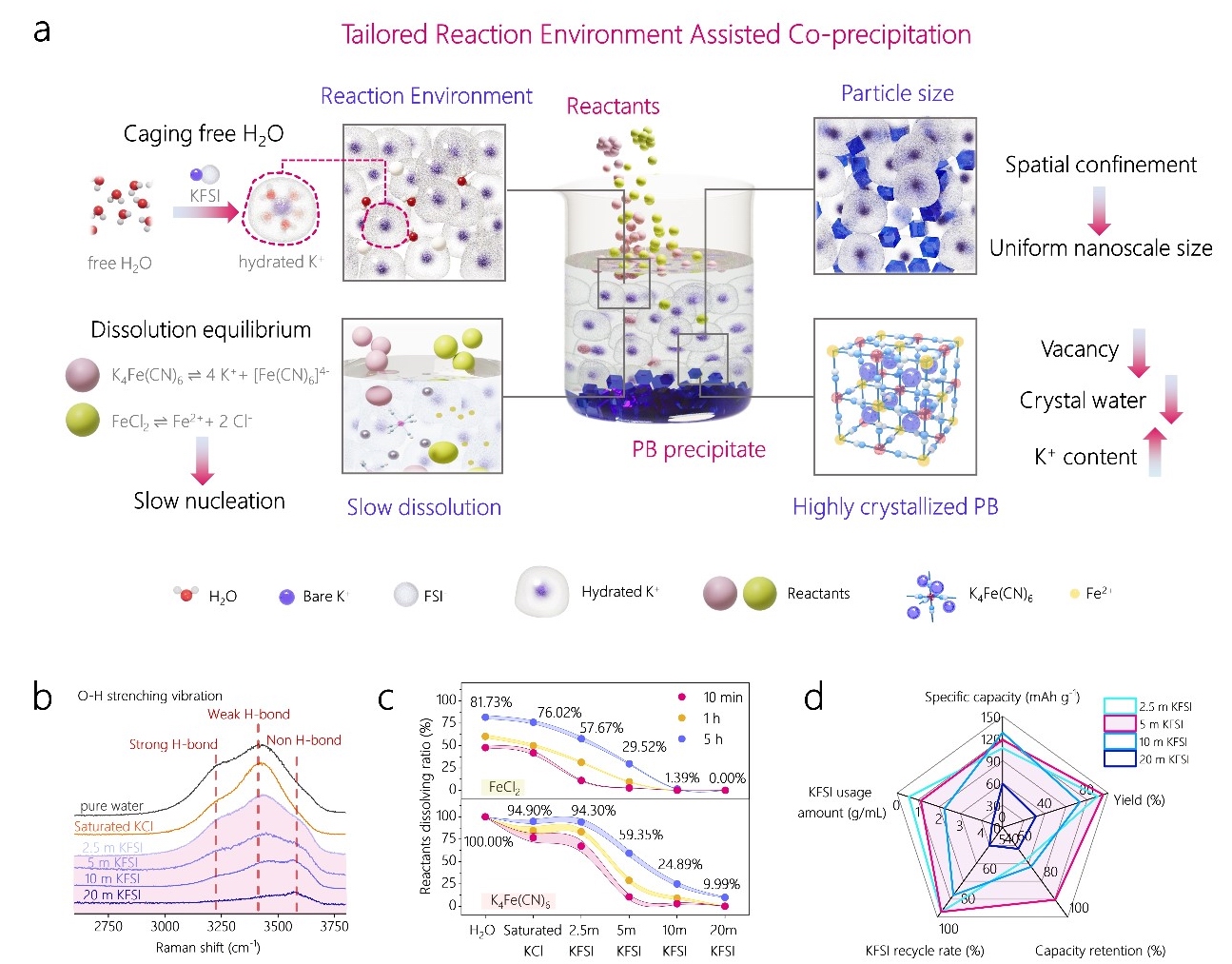 针对钾离子电池铁基普鲁士蓝不可控的[Fe(CN)6]4-空位和结晶水问题,团队提出了一种反应环境定制的合成策略。通过采用高浓度双氟磺酰亚胺钾(KFSI)/水母液,调控反应物溶解动力学,降低自由水活性,实现了反应物缓慢释放。所制备的普鲁士蓝正极展现出优异的循环稳定性:50 mA g-1下循环2500次(超一年)。此外,通过定量校准母液浓度,实现母液多次循环使用,合成的材料具有高度一致的批次稳定性,为低成本、高性能的普鲁士蓝正极材料的合成提供了新思路。